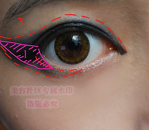 5号画在眼头,画一个假眼角~下面的部分画到眼睛比例的3/2处即可。