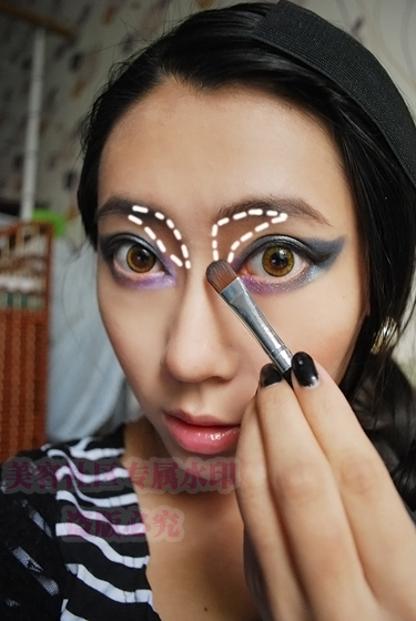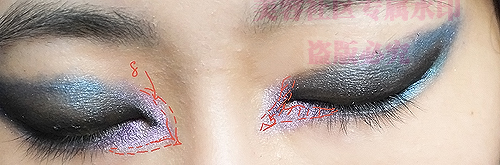 8号高光画在假眼角外侧,要紧贴假眼角,但是不宜过长,最佳位置,一下眼5号眼影的3/1处为最佳。
