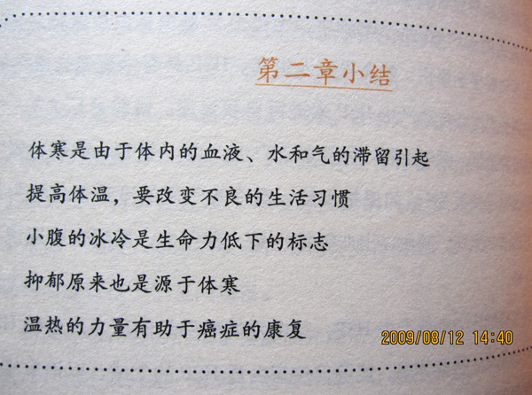 这点我是很有体会阿,当我知道自己是寒体质以后,我开始注意保暖,只喝热水或者常温水,对冰饮是绝对说“NO”的,而且还根据书中介绍的开始特别注意腹部的保暖!因为肚脐下面的子宫和卵巢等脏器都需要得到温暖,我还专门买了一个“腰腹带”,每天晚上热敷肚子15-30分钟,整个肚子暖暖的好舒服啊,而且睡眠质量也提高了,可脸上开始拼命的冒痘痘!我分析是体内的那些湿气因为体内气血开始运行要排出体内了!所以我不是非常在意这些痘痘,从开始冒痘到现在已经快一个多月了,可我并不着急,因为我知道那是身体在排毒和湿气!因为我这个寒体质是28年累积起来的哦,所以我希望给自己的身体足够的时间排出以前积攒的湿气和毒素:)