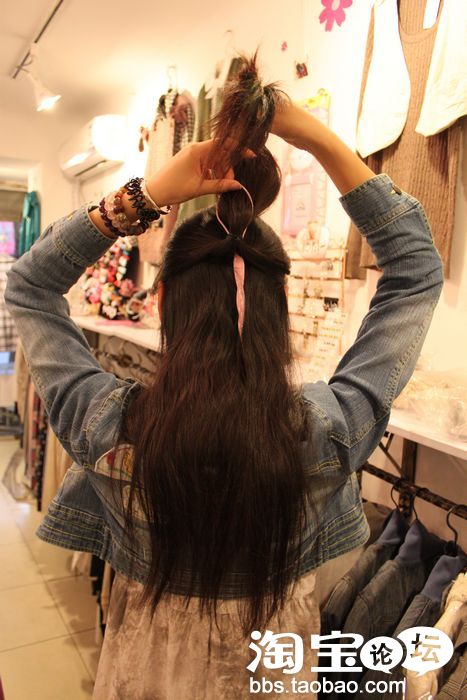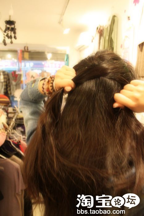 将头发按上下两部分一分为二 抓起上面的一半 扎起来