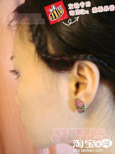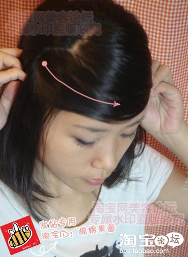 接下来是刚才简单BOB造型的是升级版本,重点还是在难缠的刘海,看到了吧?这里是想把刘海搭到左边,所以从右耳上方借了一绺发束,这个步骤是为了把刘海的发梢弄的整齐服帖一些,本身没有刘海的MM不用担心弄不好,很简单的~~~一定要Z字形的,这样就可以盖住分界线,后面有图片可以看到最终效果哦~~