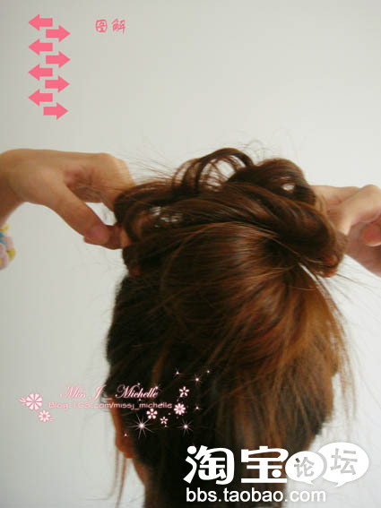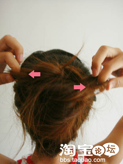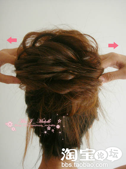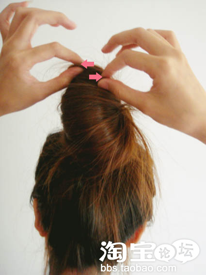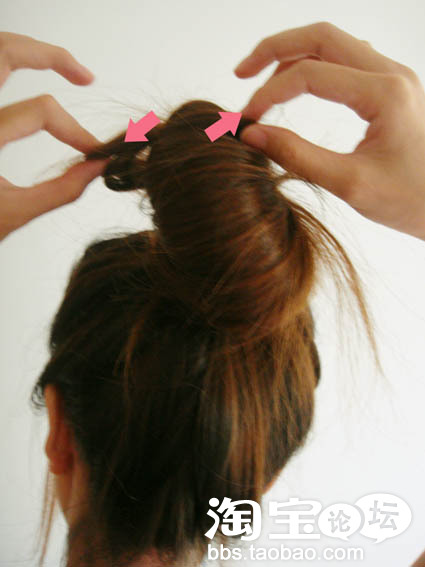拽发固定。将所有拽出的发圈全部套在左右手的食指上,然后分别向左右扯拽,效果基本上就能看出来了哦!嘻嘻~