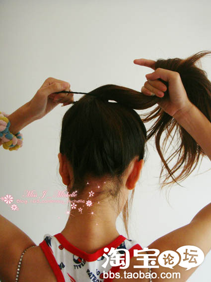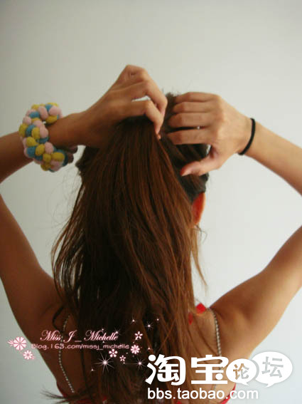 扎马尾。歪歪习惯用手抓头发,不喜欢用梳子,梳子梳出来的有些过于整齐,不自然。所以用手代替梳子把头发抓起来,扎成马尾,越高越高。用一般的黑色橡皮筋就可以,但是一定要扎牢哦,不然会掉下来的