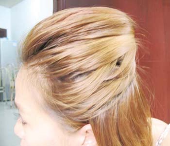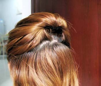 实行“挖洞”方法,从我大拇指指的方向,从底部挖一个洞洞,将头发塞进去。