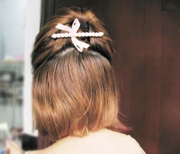 黑色发夹,必备的喔。将头发卷成一个半圆的形状,如上图。