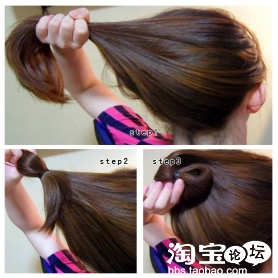 把剩余发尾的发丝顺时针绕在马尾根部固定好。握起头发的部分向前后左右四个方向拉开。