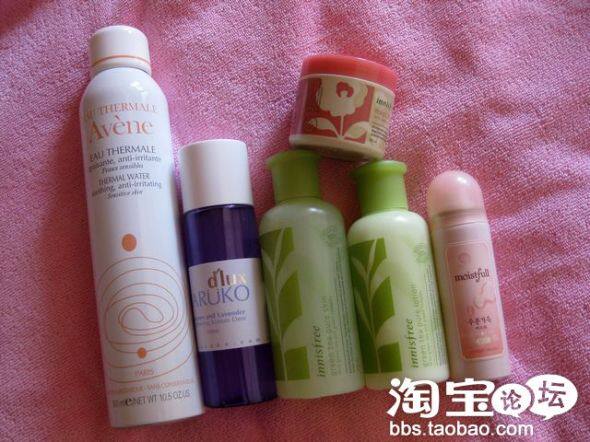 左起:雅漾喷雾 牛耳茉兰薰衣草雪耳雪肤美肌液 悦诗风吟有机绿茶爽肤水