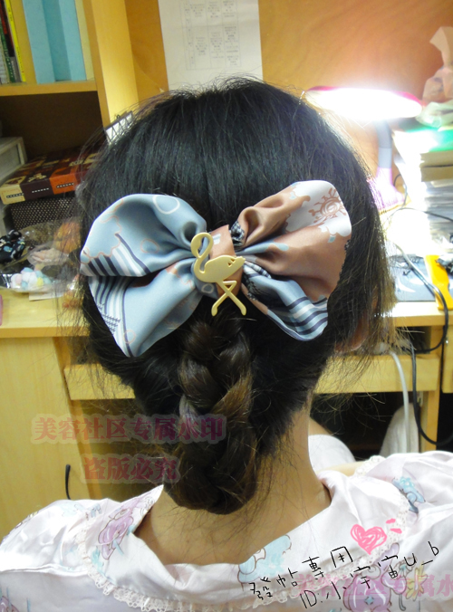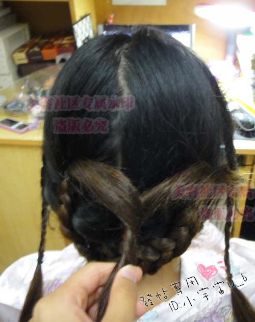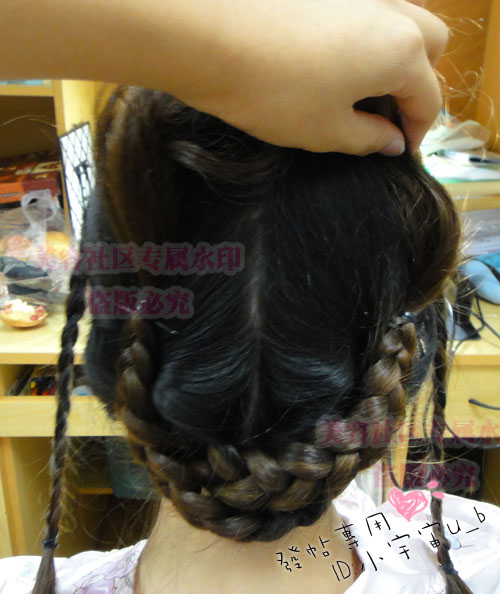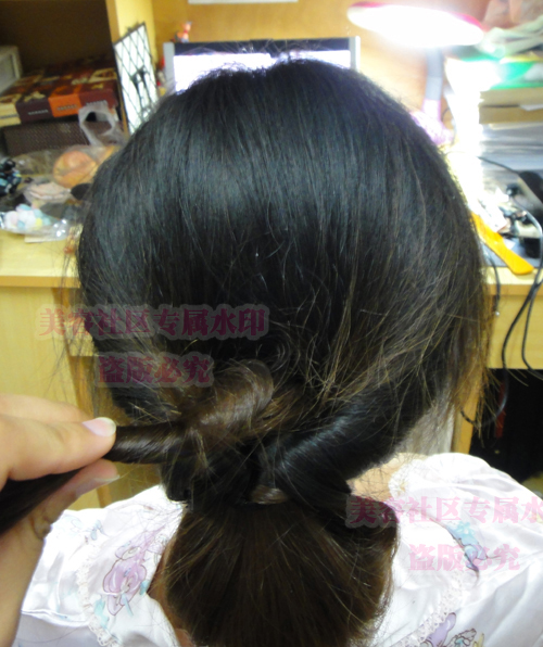 第四步:将辫子按如图所示的方向绕上去.用黑色夹子固定住.