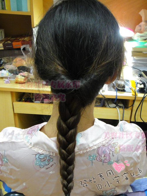 第二步:马尾抽出来之后,将其辫三股麻花辫.尾部用黑色皮筋固定.