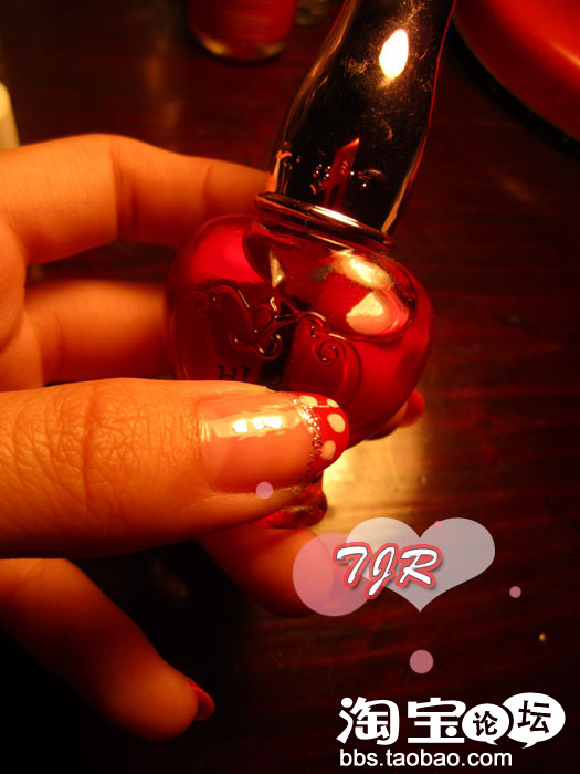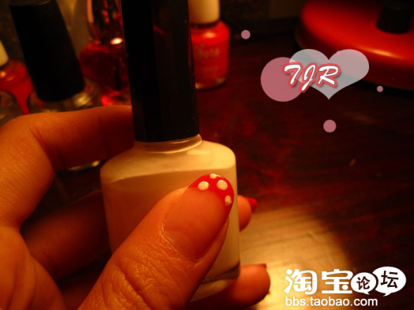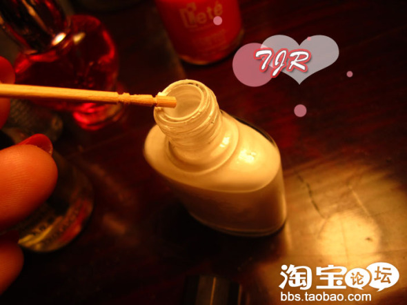 用牙签平的一头沾取白色的指甲油点在红色法式的部分