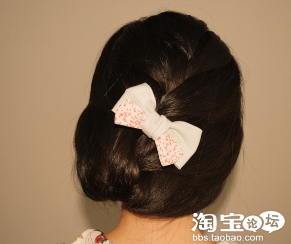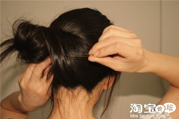 余下的头发卷起后绕刚才扎起来的辫子,然后用发夹固定