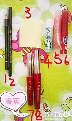 1、眼线笔 2、眉笔(看你画不画眉毛,可有可无)3、美目贴 4、唇膏 5、唇彩 6、妮维雅唇膏(当口红用)7、8、火烈鸟睫毛膏(大家都熟悉的)