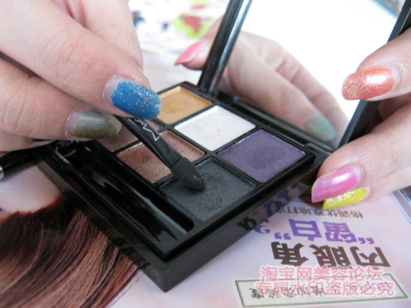 用白色的眼影咯~~~它用来干什么捏?沿着唇线画在中间三分之一~这样嘴唇就立体起来了~~~上下都要画~