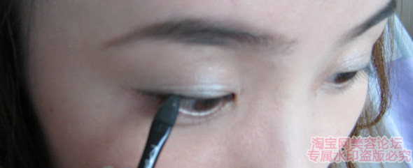 眼头就不上眼影了,因为刚开始上了白色打底,跟刚刚的眼尾的颜色不会分段很明显,所以就直接用白色了,这样眼睛会更亮一点~