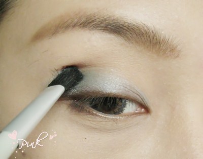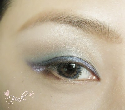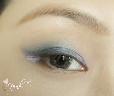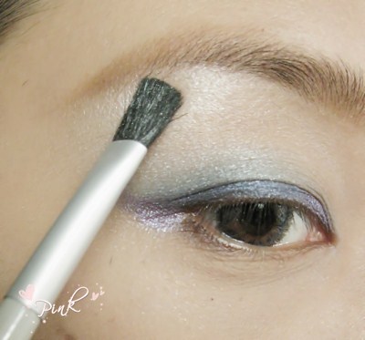 眼妆部分:在用紫色眼影在眼尾处和眼皮前方涂一点点.
