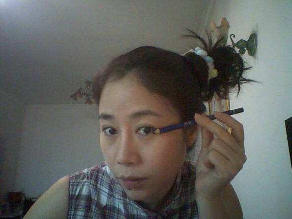 画好啦,这是我随便挽的一个丸子头,故意挽偏到一边,看起来比较俏皮些,呵呵。这根发绳也是刚买到的,质量很不错哦,秒杀价才六角五,后悔没多买几个。很可爱!