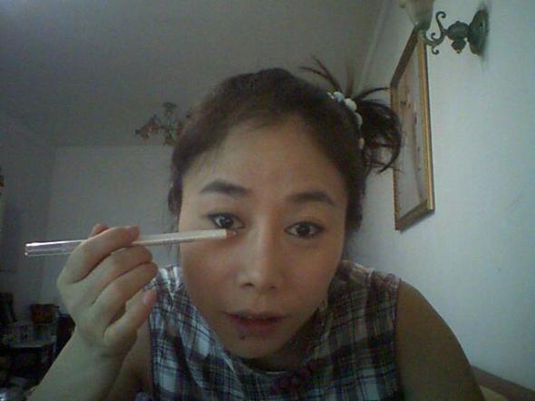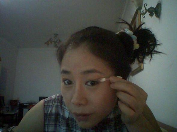 这张是下午刚睡醒的样子,感觉脸都睡肿了。郁闷,我经常睡觉起来感觉脸就是肿的。先涂上粉底夜,再贴上双眼皮胶布。