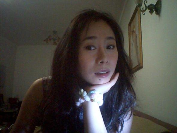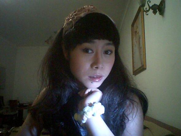 再想扮粉嫩滴,就戴上刚淘来的假发刘海和宽边发箍,齐齐的刘海,似乎看起来让人看起来更嫩些,哈哈!