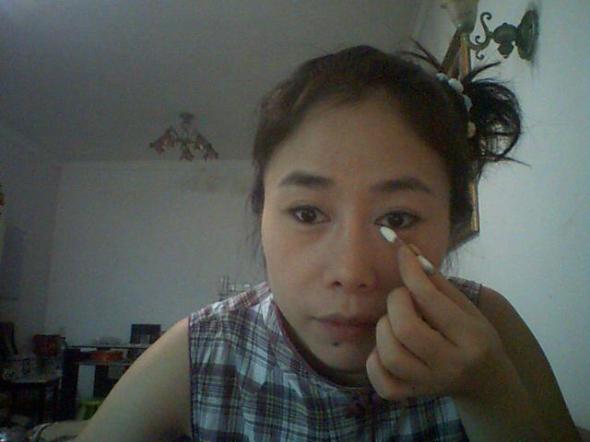有点黑眼圈,于是用遮暇笔涂一下。再涂一层定妆的干粉。
