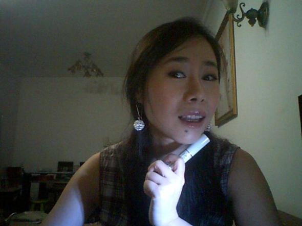 然后用粉刷扫上腮红,并涂上粉色带珠光的唇彩。