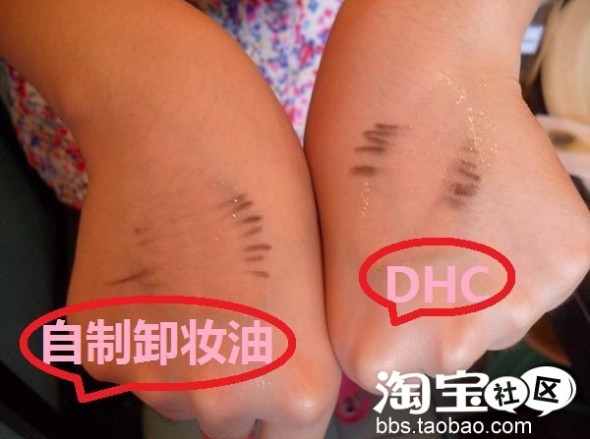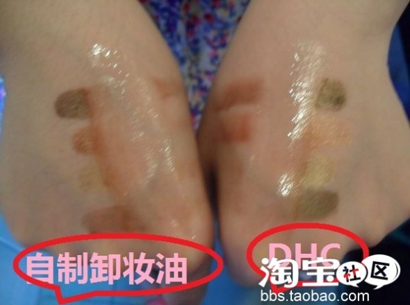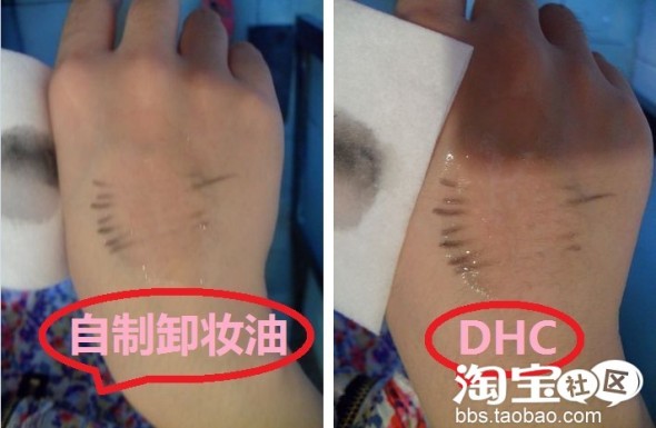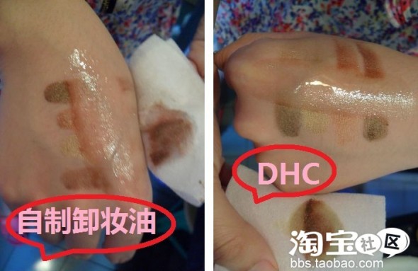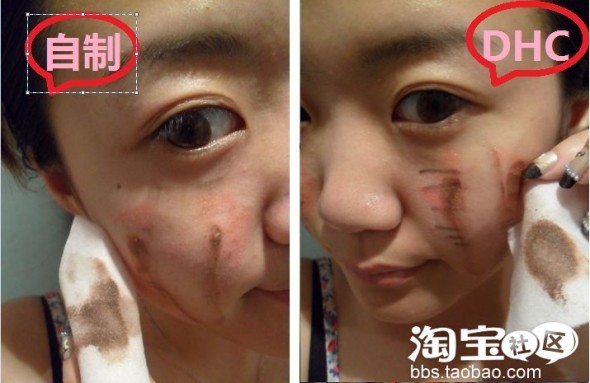 下面用彩妆 用自制卸妆油和DHC来对比卸妆效果