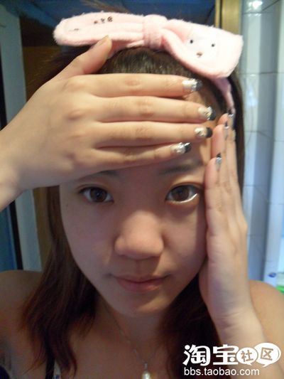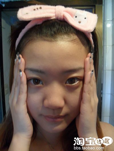 双手并拢后放置在额头,以画圆圈的方式卸妆,眉毛的地方不要忘记。