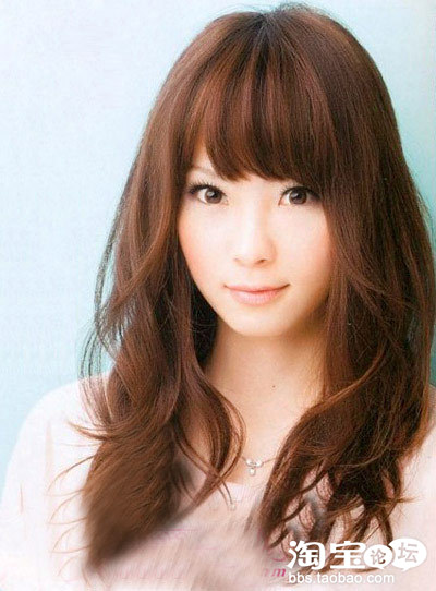 此款发型的重点是位于眼睛上方的较长齐刘海,可以很好的修饰圆脸,从视觉上拉长面部的比例,而又有效减少了脸部面积。喜欢长发的圆脸MM不妨试试这款发型。