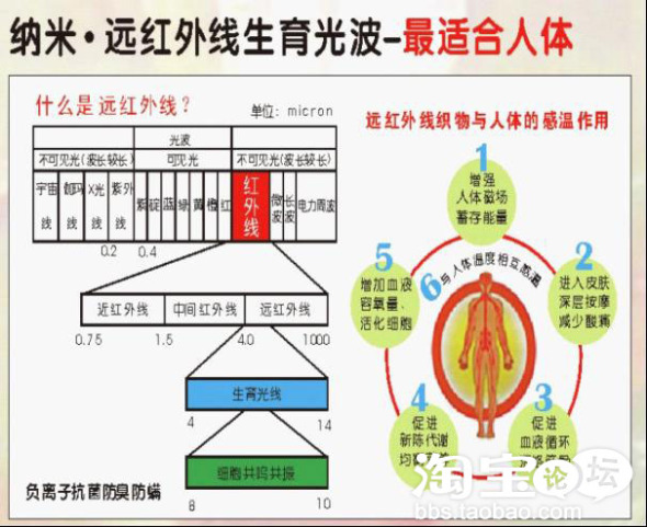 根据科学家的研究,当两段波长相等相互作用时,就会产生共振现象,而人体是生物体,人体70%-80%以是水分子组成的,在共振作用下,首先激活了水分子的振动能级,而产生一系列生理是的反应,通过科学检测,远红外线的热效应和使人体共振吸收后主要产生以下几方面功能: