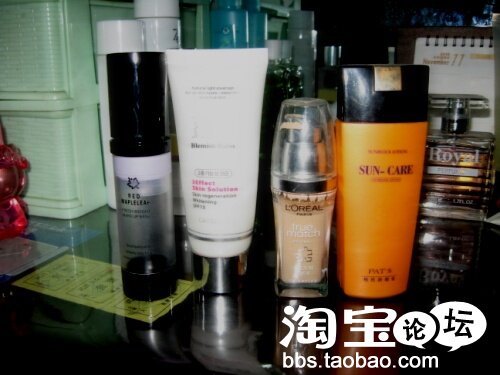 打底类,从左开始,啥名字不知道的隔离乳,不过很好用,100多块钱,很薄,遮盖力还可以,容易推开~,据卖我的那个小伙子说是和深蓝彩妆是一家子的~~~~专业。