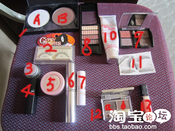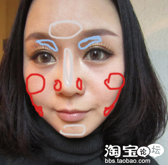 先用10号BB霜作个打底,再把5号散粉定妆,眉毛是12号中A号色深棕色上的色,然后用6号刷子把1号修容粉中看到脸上用白色圈出来的部份用A号上色,提亮,蓝色圈圈和红色圈圈的部分用B号修容,这样才有立体感