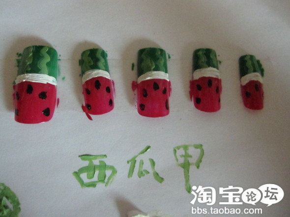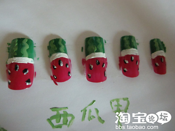 然后在甲跟部分画上西瓜子 指尖部分画上瓜皮的纹路