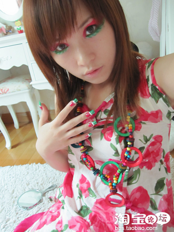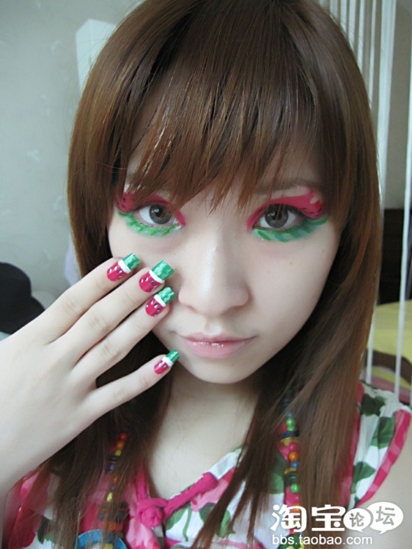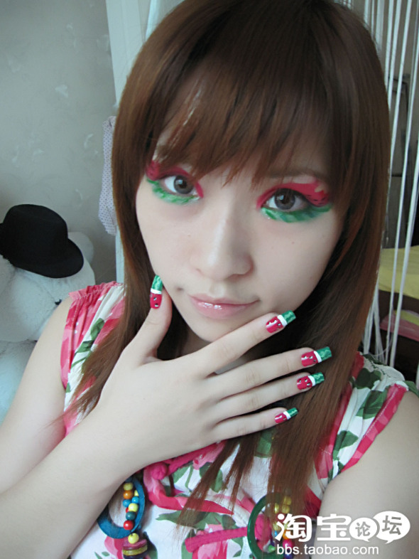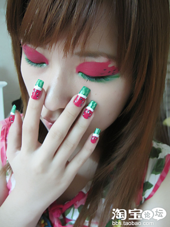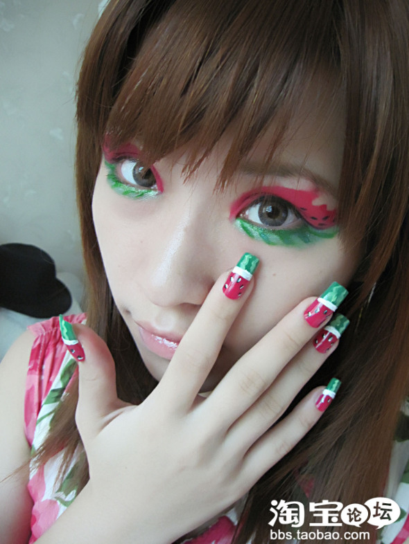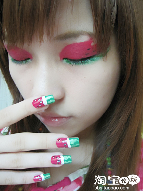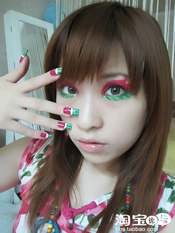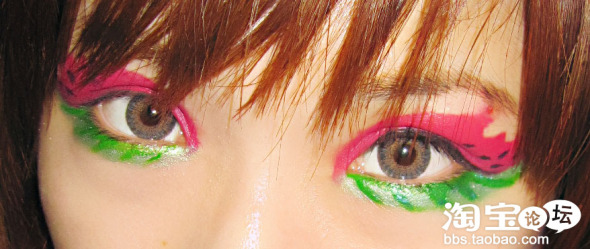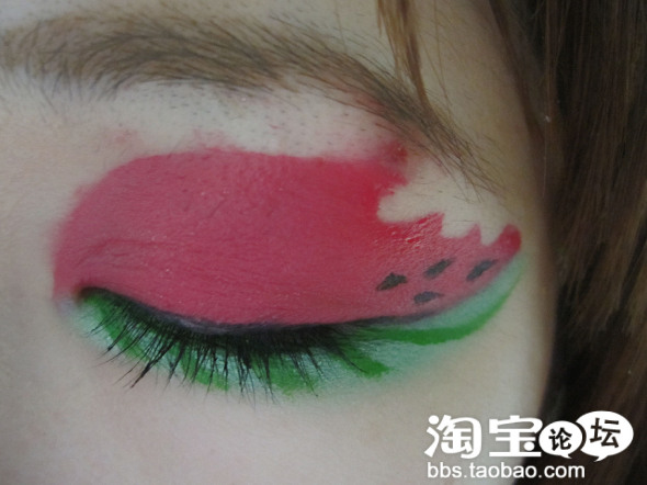 下眼皮先用KAFELON的蓝色打底 然后用绿色的彩绘画出西瓜的纹路 齐活