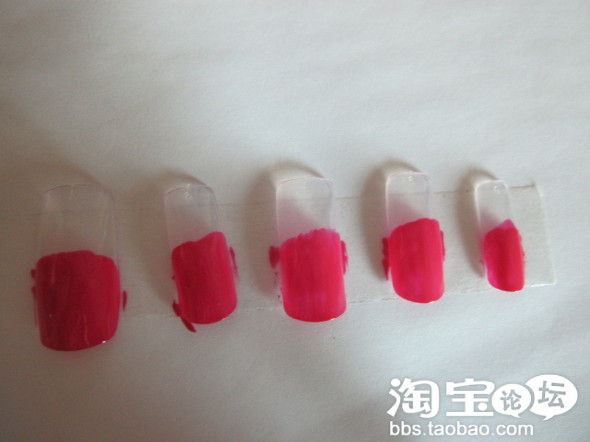 首先处理指甲根部 刷上红红的甲油 从中间到下面 指尖部分空出来
