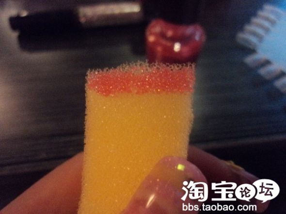 7.在整个指甲表面都按压有颜色部位的海绵,轻轻的,不用太用力哦