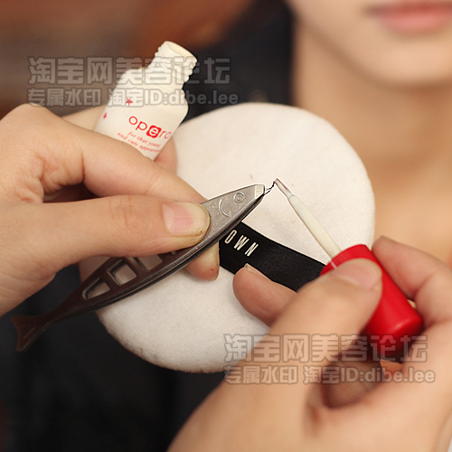 开始粘哈~~贴着睫毛粘.从尾部开始粘