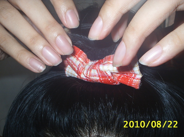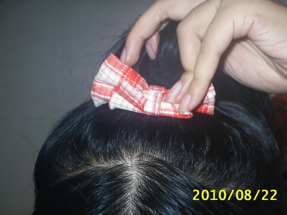 缠第二圈的时候,一定注意发圈的橡皮筋要跨过饰物部分!这样就能牢固美丽地把发圈固定在马尾上了!!!!!!!