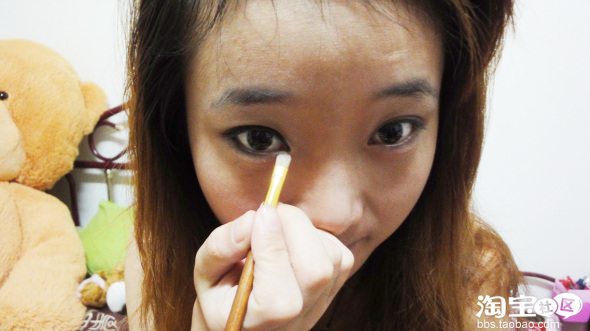 因为是日常妆,个人日常不喜欢浓重的眼影,白色涂满整个眼窝提亮,在双眼皮褶皱处上咖啡色记得
