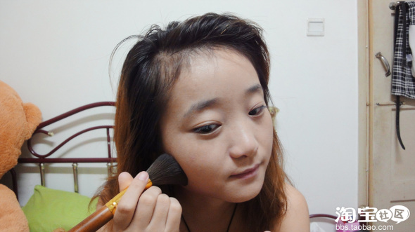 用大号的粉刷上干粉,与粉扑比较起来用粉刷出来的效果会比较薄透(露华浓的粉饼)
