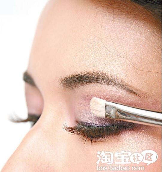 2 在眼尾位置扫上紫色眼影,向外拉开至耳侧位,制造延长效果。