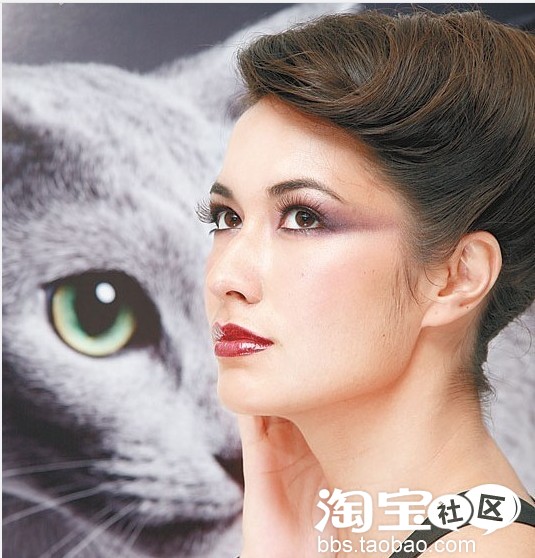 以往的猫眼妆,多以黑色作主打色调,但今个秋季却有所改变,用上不同的色彩打造猫眼,其中以极具女人味的深紫红色最为瞩目,深紫色不但有效加深眼部轮廓,更可增加双眼的明亮感。猫眼的特色是要连接上下眼影,形成圈状圈住眼睛,眼影范围较大,在眼尾位向耳侧伸延,细长的形状非常突出,用眼线液勾画出向上剔起的眼线,令双眼加倍有神。由于眼影及眼线的形状都是打斜向上,所以胭脂亦要打斜扫上,令整体妆容更一致。为了营造野性的感觉,唇部亦是重点,用紫红色唇膏画出对称的唇形,令双唇更丰满,再加上具光泽感的唇彩,更为性感。