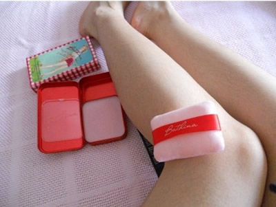打开这款美丽定格身体香膏的味道有股淡淡的甜味儿,丝滑质地,有点像草莓巧克力味儿的冰淇淋呢,马上就该八月十五中秋节了,也有点慕斯月饼的感觉哈~带有烈焰红色Bathina标志的淡粉色的绒扑非常的可爱,用它蘸少许香膏并以打圈的方式均匀涂抹于身上,恩,感觉不错,光泽感一度飚升,嘻嘻。