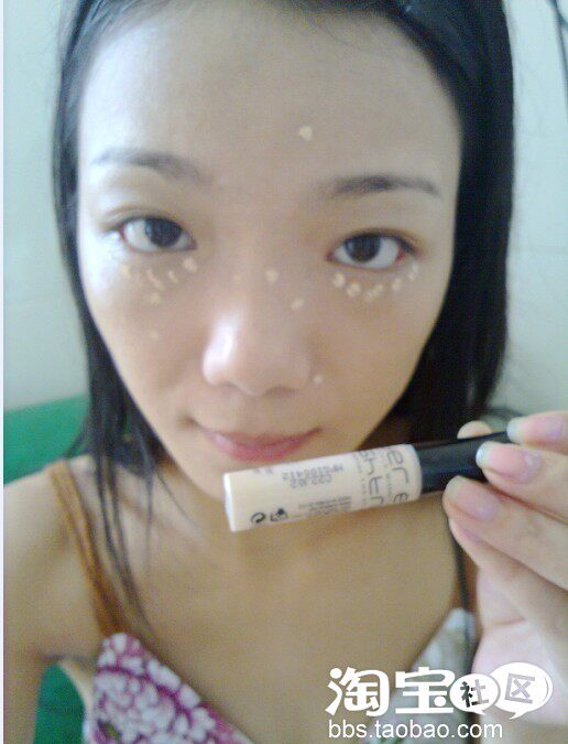 然后用遮瑕膏,把黑眼圈和脸上的痘印,雀斑,瑕疵遮盖一下。用的是2010年新款谜尚眼部遮瑕液,可以遮全脸的,自然服帖,很好用。