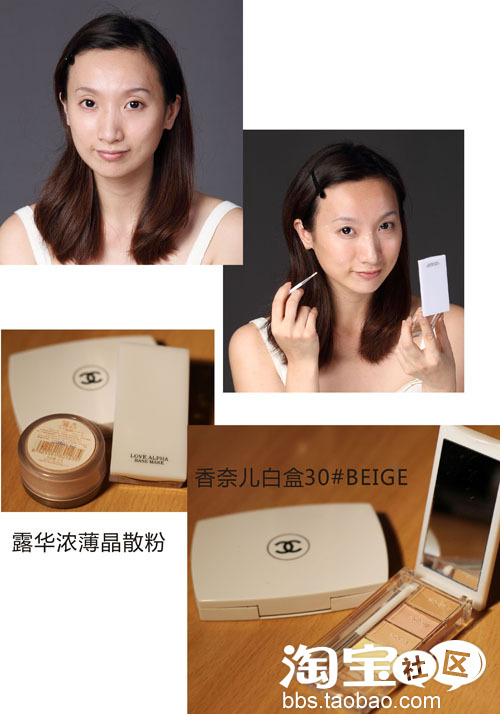 然后用菲菲怎么都用不完的香家白盒薄薄的铺上一层,接着用大号的散粉扫把有珠光效果的露华浓薄晶散粉扫在高光位置:额头,鼻梁,颧骨上方,下巴。