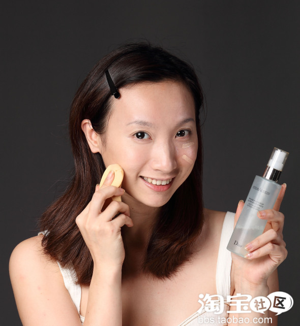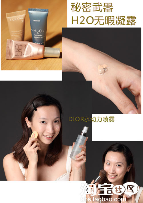 于是就可以上粉底啦,菲菲是很贪心的人,既想要粉嫩无暇的好脸色,又想要透明的清爽质感,于是在MAC 大中华地区代言人张帅大师的指点下,我自己研发了3cream融合法。将适合自己肤色的遮瑕感强的粉底液和有填充细纹和补水作用的H2O底妆凝露,再加上有珠光效果的BB霜,各取1/3,分量可依据当天皮肤情况调整。再用DIOR补水喷雾喷湿海面,将3CREAM均匀的扑在脸上,特地留了张大点的图片,看看是不是很服帖,很自然?
