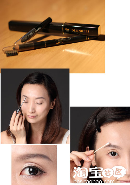 首先用笔将整个形状勾勒出来,然后用越到尾巴越重的力道填满它,这时的眉毛会显得很重,于是用眉扫依照眉毛的走向刷出纹理,再用棉花棒修饰出过渡的感觉。