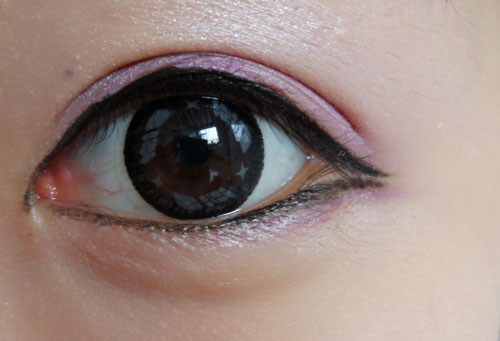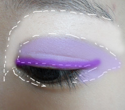 在眼下角和眼上角用紫色,眼尾用白色(最好是带珠光的)用画眼线的方法轻轻地画就行。