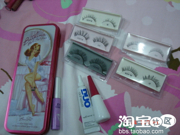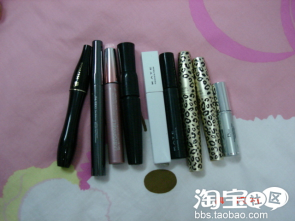 从左至右:兰蔻 资生堂 美宝莲 懒人睫毛液 kate纤维底膏,kate 睫毛膏 豹纹的是不知名牌子,很好用,就是有点麻烦。