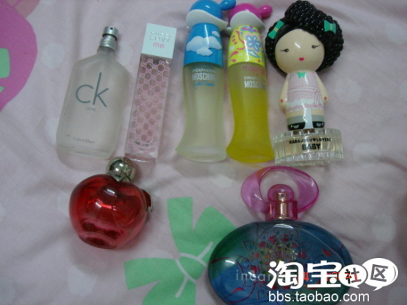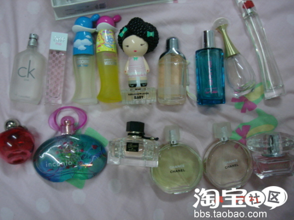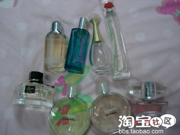 下面一排,1,gucci的flora,粉嫩的香,也很适合随性的女孩。2,3,chanel的chance,这个不用介绍了吧,一瓶是最初的那种绿色的,还有一瓶是今年新出的粉红色的。4.范思哲的粉钻,这个我现在用的最多,最适合我的一款了。