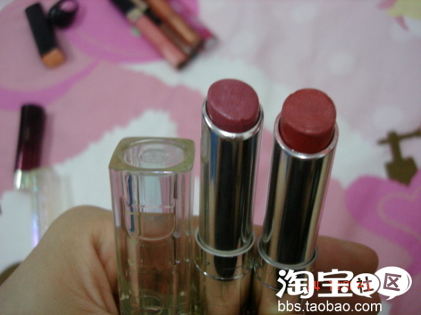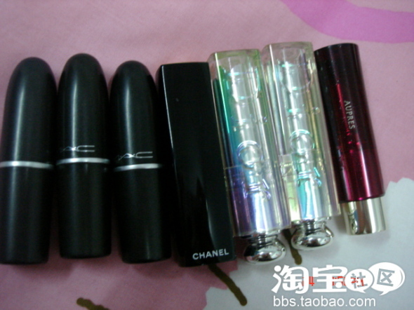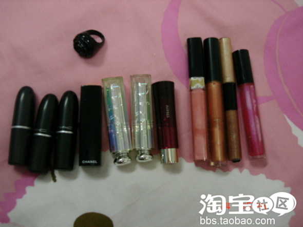 从左到右,MAC,3支。chanel,一支。dior,两支。欧泊莱,一支。最上面的那个是安娜苏的唇彩戒指。一般都当戒指用,很少用来当唇彩。。。