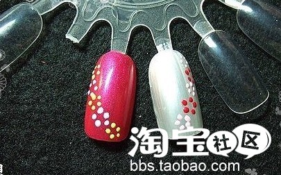指甲油差不多干后,我们开始画点点花,两指的底色因为不一样,所以我们也画上不同颜色的花来搭配底色,各画上2朵点点花,中间留个空间